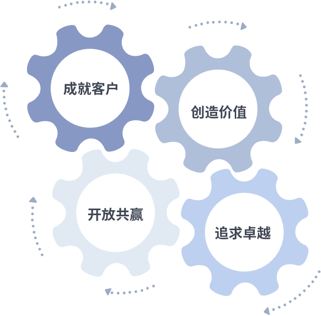 成就客户是一切决策的出发点,,创造价值是衡量所有工作的标准,,,,追求卓越是我们做事做人的态度,,开放共赢是我们的格局也是最终的结果。。。。价值观的齿轮环环相扣,,推动着组织里的每个人不断向前。。。。